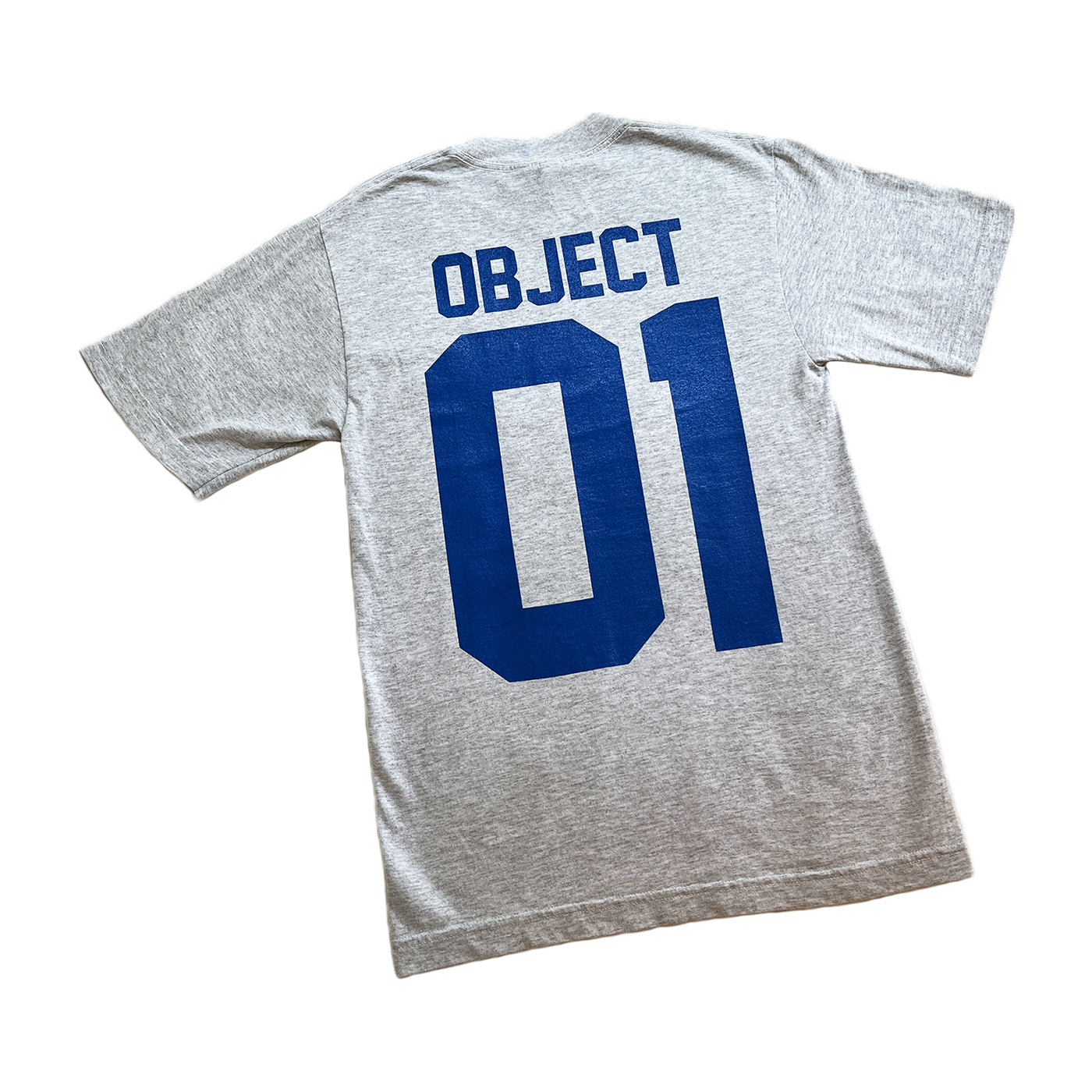 Printed on LA Apparel heather grey 100% garmented dyed cotton men's/unisex t-shirts. Boxy and oversized fit, size down for a more fitted look. Double sided print with "Object 01" on the back, vintage homemade jersey style.